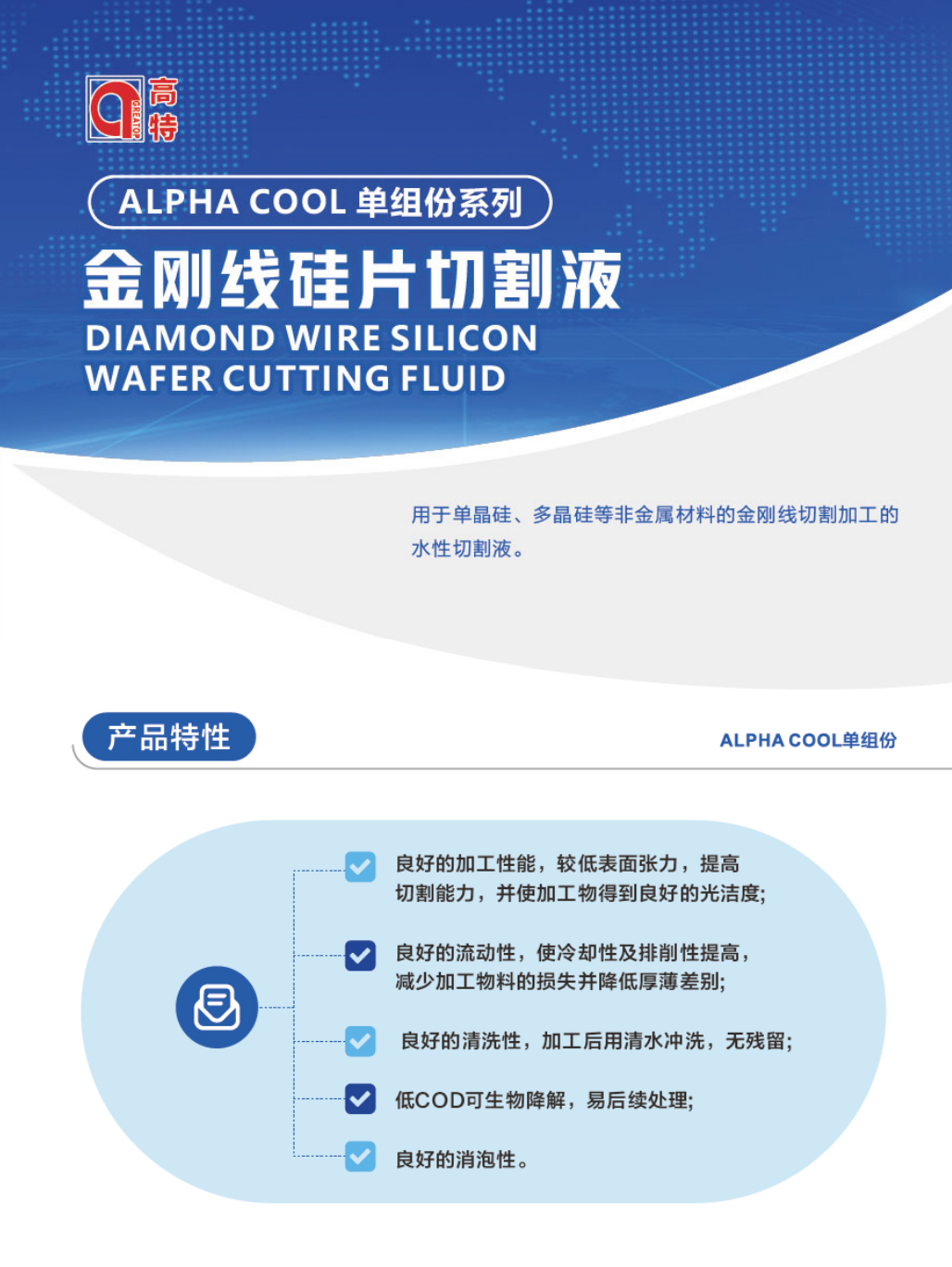 產品用途:GREATOP ALPHA COOL BS-1用于藍寶石等非金屬材料之線切割及研磨等加工的水性加工液;